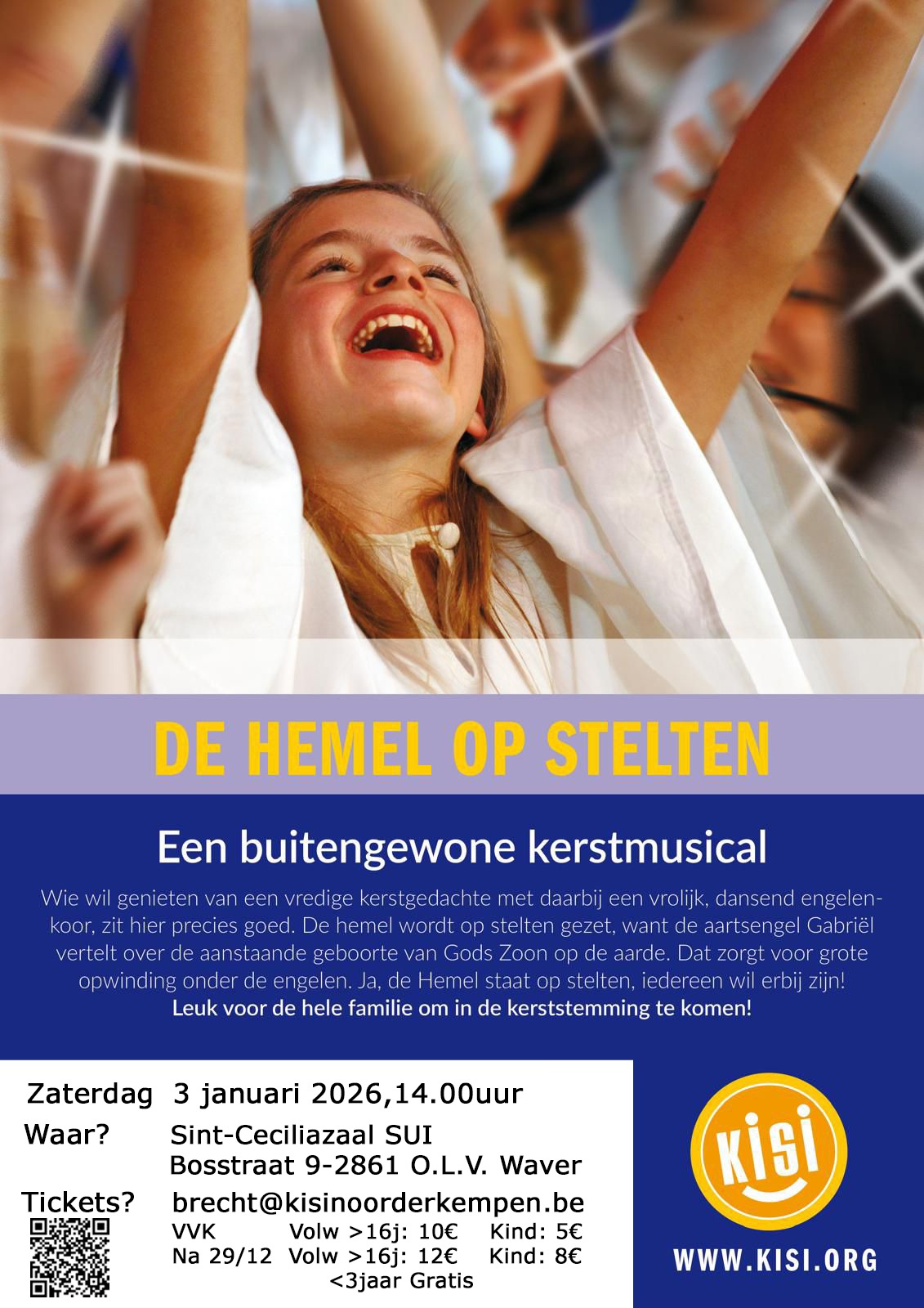 Koop hier snel uw tickets voor de Kerstmusical "de Hemel op stelten" op 3 januari 2026 in Onze-Lieve-Vrouw-Waver, Sint-Ceciliazaal SUI - Bostraat 9. Tot 29 december kan dit aan vroegboekkorting. De musical begint om 14u en eindigt uiterlijk om 16u.